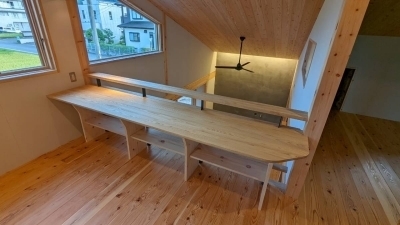 美しく面を取られた2階フリースペースのカウンター「1階からカウンターを見たときの見え方にもこだわりました。」(Project担当D:Tさん)