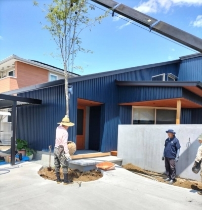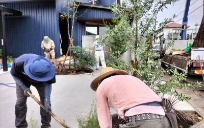 樹種や高さ・配置場所を事前に検討した植栽計画に基づいて、それぞれの植栽を配置していきます。