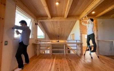 柱や梁に向かい、木本来の美しさや温もりを引き出すために丁寧に磨きます。