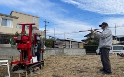 地盤調査は、地盤を調べることでその土地に安全に建物を建設できるかどうかを判断するために行われます。 調査方法は先端がキリ状の器具に荷重をかけ、回転させて地盤の強度を調べます。