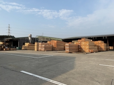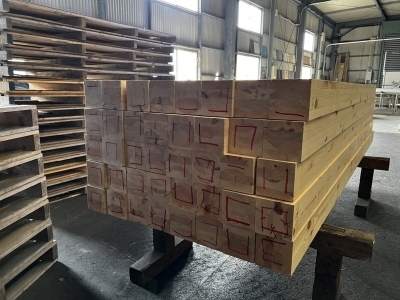 現場にて基礎工事が進む中、製材工場にて構造材の「番付」を行いました。