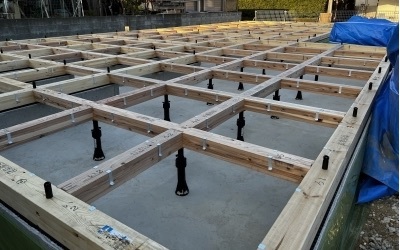 ひとつひとつ丁寧に設置していきます。 そして土台・大引の敷き込みが完了しました!