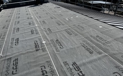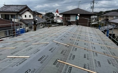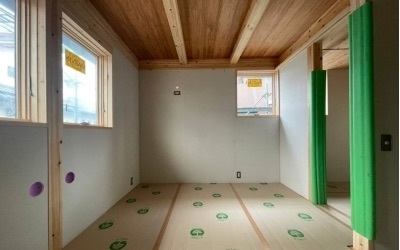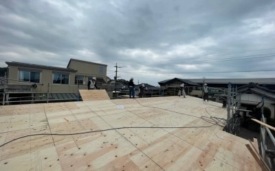 屋根の防水下地をしっかりと施工した後、建物全体を厚手のシートで丁寧に包んで建て方完了です。