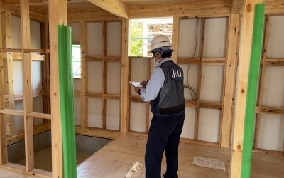 屋根葺きまで完了すると、第三者機関による躯体検査を行いました。