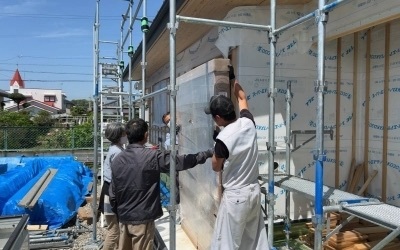 1枚20kg以上もある面材「モイス」で外周を覆っていきます(およそ80枚!)。