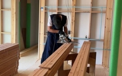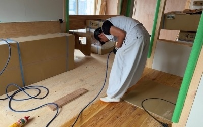 そして床杉板の施工。一枚一枚丁寧に納めていきます。