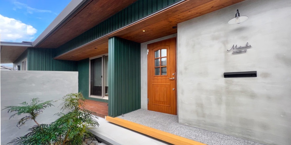 緩やかな屋根勾配、グリーンの角波型の外壁。雰囲気抜群ですね。