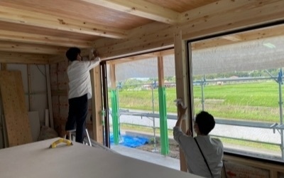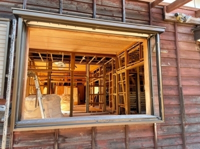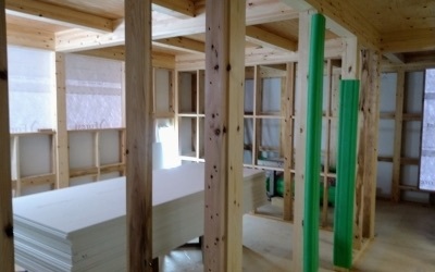 建物内部の状況です📷 プランに合わせた仕切り壁の木下地やサッシ開口部分の下地処理などを行っております。
