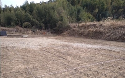 新しいお家の位置を示す縄が張られ、敷地全体のイメージが見えてきました。