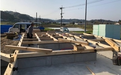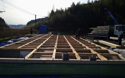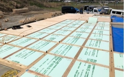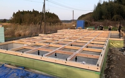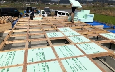 土台、大引きと組み終えたら、 その碁盤目状のマスの中に断熱材を設置します。