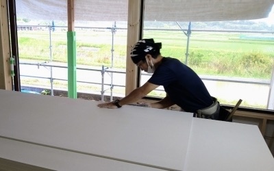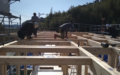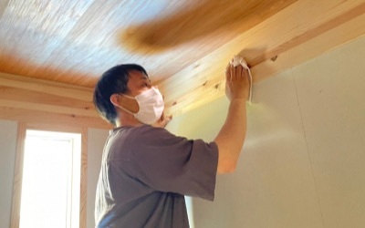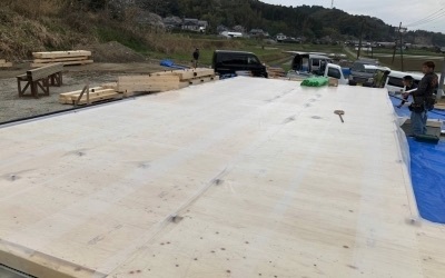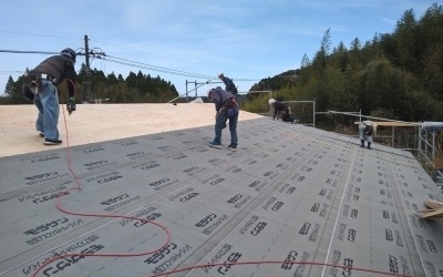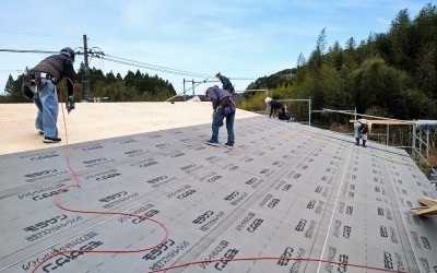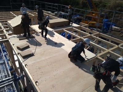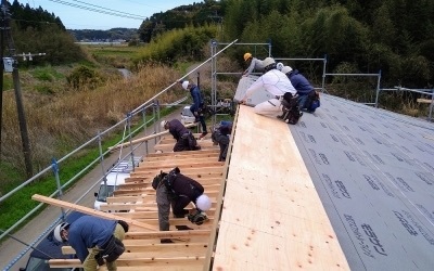 午後、一枚一枚丁寧に合板を貼り、屋根を仕上げていきます。