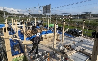 屋根のルーフィングも貼られ、ブルーシートで 雨仕舞いを終えて建て方完了です。