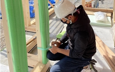 息を合わせ、丁寧に確実に構造金物へ緊結していきます。
