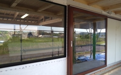 床パネル設置後は透明の保護フィルムで雨養生をしっかりと。