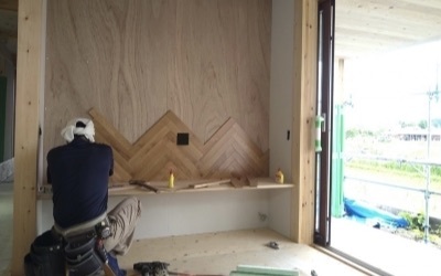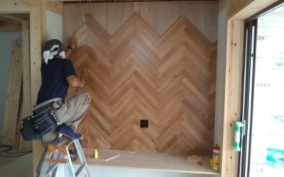 一枚一枚角度を合わせてカットされ、間違いが許されないヘリンボーンの壁。