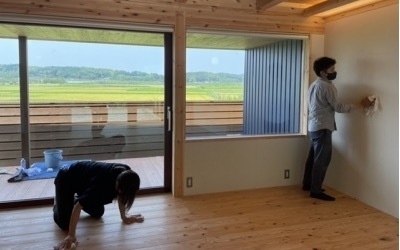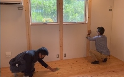そのころ一階では、柱の傷防止のための養生が行われています。