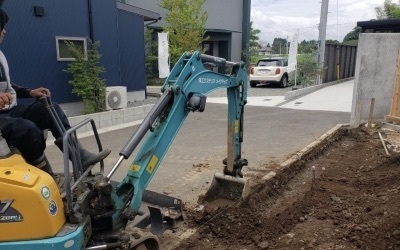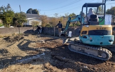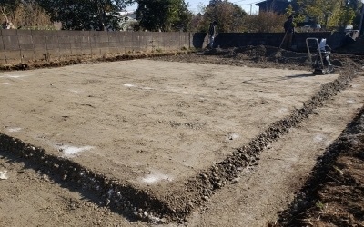 まずは建物の配置を入念に確認しGL(グランドライン)を基準に建物内の床掘り、鋤取りから開始。