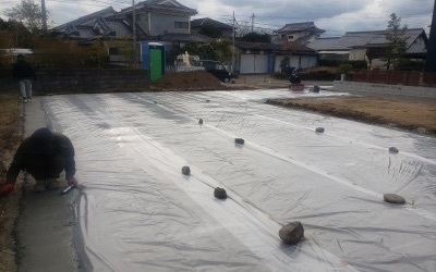 鋤取り後は砕石を敷き均し転圧を加えるとその上に防湿シートを張ります。