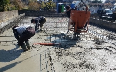 早速、底盤・立ち上がりのコンクリート打設へ。 連携の取れた一連の作業でコンクリート打ちの工程がスムーズに進みます。