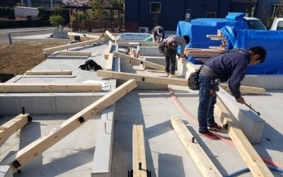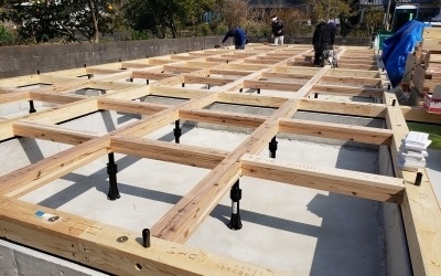 土台が組まれたらその間に大引きを碁盤目状に組んでいきます。