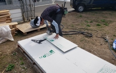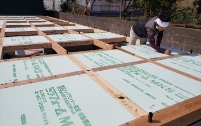 碁盤目状の間には断熱材を設置。 事前にカットされた断熱材を隙間なく丁寧に落とし込んでいきます。
