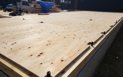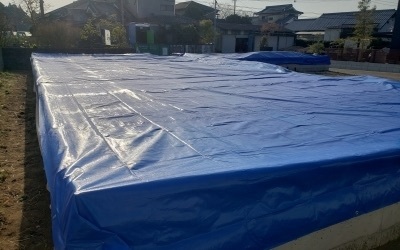 さらにブルーシートで二重の雨養生。 天候にも恵まれ予定通りに土台敷きの工程が完了です!