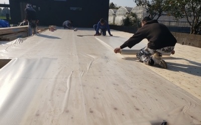 パネル設置後は透明の防水シートを丁寧に張り雨露から守ります。