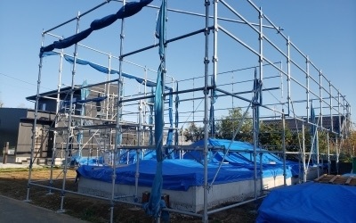 後日、構造材の搬入・仮設の足場の設置も終え万全な体制が整いました。 「Frame」建て方へ向けて準備万端です!