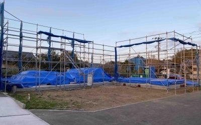 早朝から始まった工事も夕方には、屋根まで到達します。