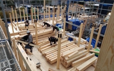 番付以来、柱や梁と久しぶりの再会。丁寧に据え付けていきます。
