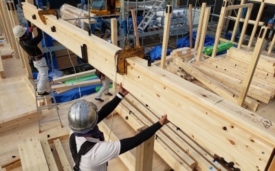クレーン屋さんがピンポイントで梁を大工さんにパス! 逞ましい梁と柱が構造金物と大工さんの手によって組まれていきます。