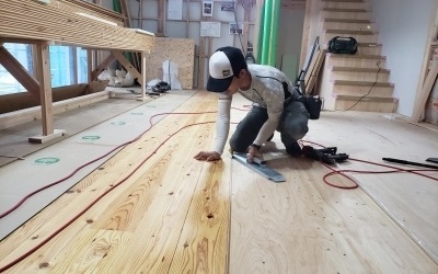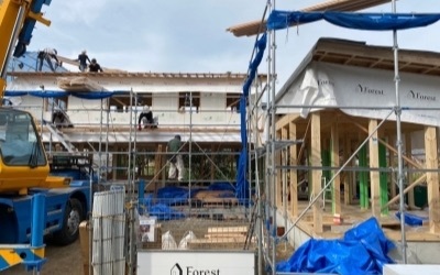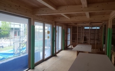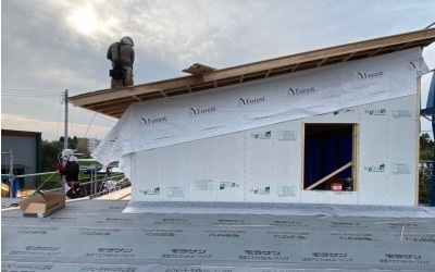 順調に進んでいる「Frame」 建て方以降、現場では耐力面材となるモイス張りが進んでいます。