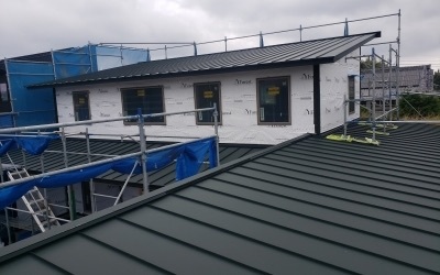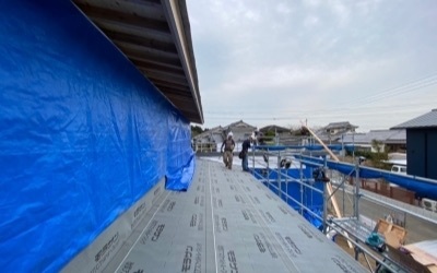 屋根はしっかりと雨仕舞いを行います。 サッシが取り付くまで建物全体も丁寧にブルーシートで包み、建て方工事無事完了です!