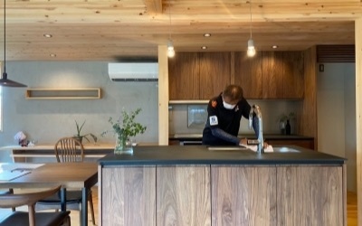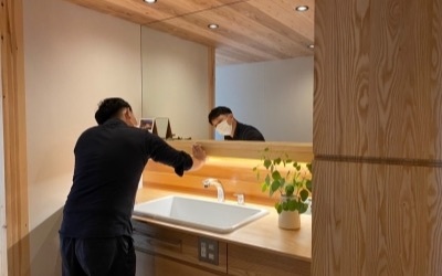 洗面台やキッチンなどの造作家具たちも最後の磨き。