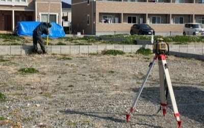 建物が配置される予定の場所について、その四隅と中央の合わせて5ポイントを専用の機械で測定していきます。