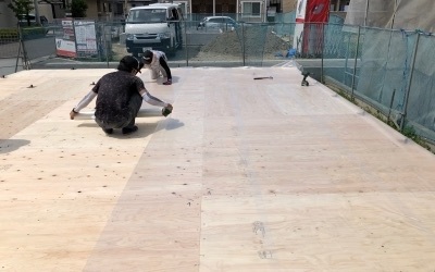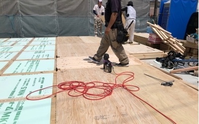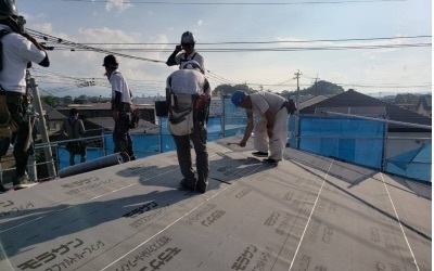 合板を一枚一枚丁寧に施工し、その上にルーフィングをとめていきます。