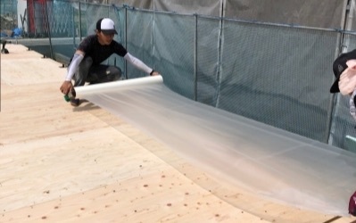 鋤取りが終わると砕石を締め固め、湿気対策のシートを隙間なく張り合わせ