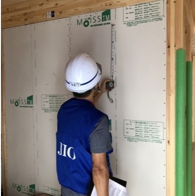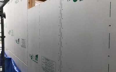 外部では耐力面材を下から上へと順番に貼り進めます。