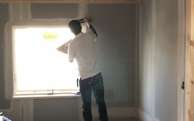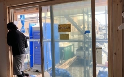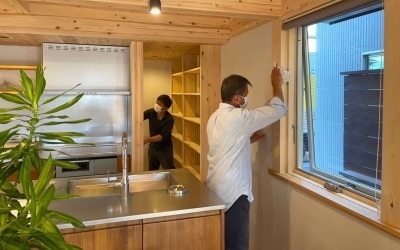 養生を剥がし、大工さんが建具の状態を確認しながら真っ直ぐに固定します。