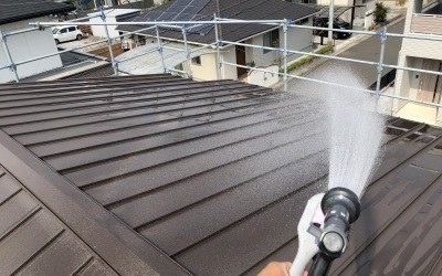 足場解体前に屋根・外壁の洗浄を実施しました。