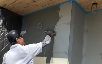 玄関廻りでは左官屋さんが絶妙なタッチで壁を下塗り中。