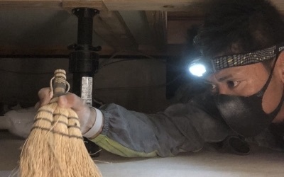 Project担当のKさんは床下へ入り、普段は目につかない場所をキレイに仕上げます。