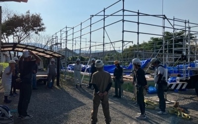 すがすがしい秋空の下、エンジンを組んで建て方前の意思統一。