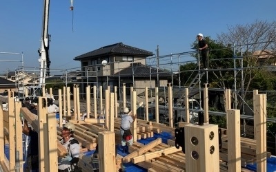 現場責任者のT監督が足場に上りしっかりと指揮し、 先日行われた番付により選び抜かれた柱や梁の構造材たちが次々と姿を現していく。