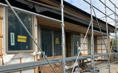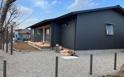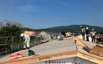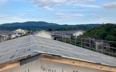 最後に、屋根の雨仕舞と建物全体のラッピングを施し建て方工事を締めくくりました。