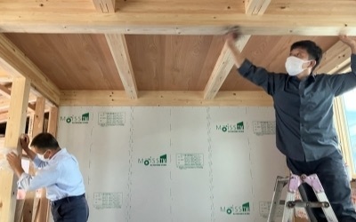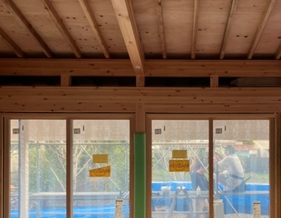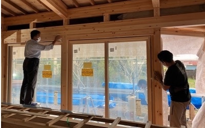 木製サッシの取り付けも完了し順調に進む「one heart」の現場
