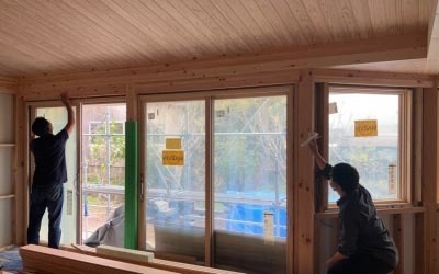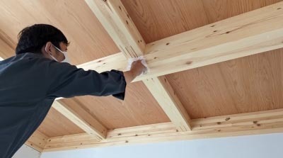 まずは柱や梁などの構造材を中心に、建て方時に付着した汚れなどを丹念に拭き上げて行きます。