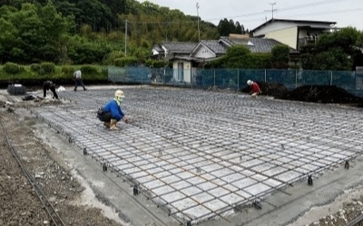 砂利を敷き防湿シートで覆い、鉄筋を組みます。