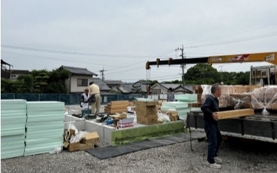 現場には工場で加工された材料たちが続々と運び込まれます。