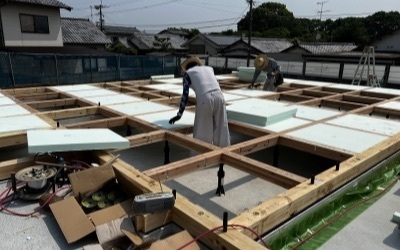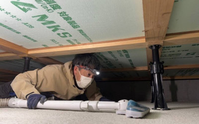 碁盤の目状に設置された土台・大引の間へ隙間なく断熱材を敷き込みます。
